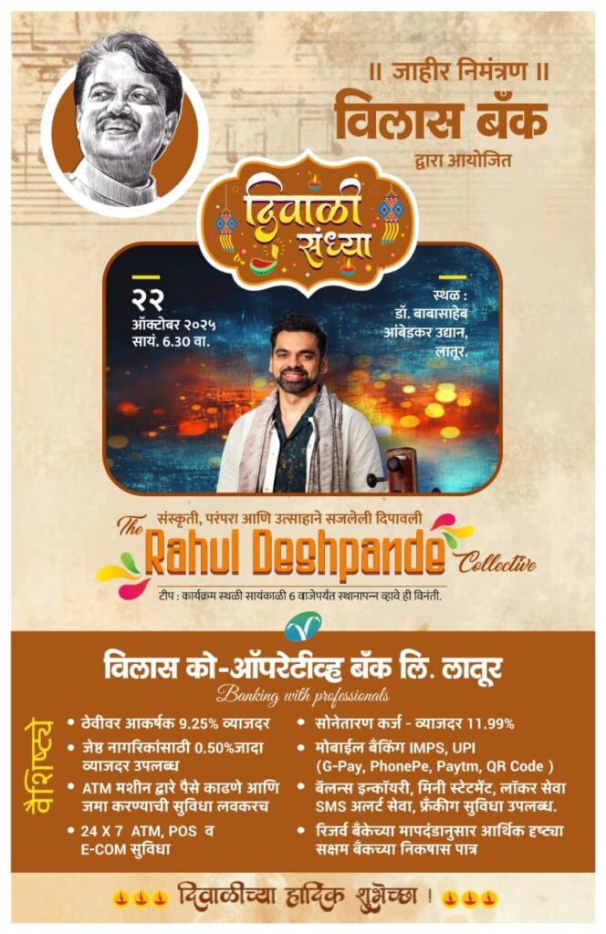विलास बँक द्वारा आयोजित दिवाळी संध्या २२ ऑक्टोबर २०२५ सायं. 6.30 वा.स्थळ : डॉ. बाबासाहेब आंबेडकर उद्यान, लातूर.संस्कृती, परंपरा आणि उत्साहाने सजलेली दिपावली Rahul Deshpande Colective टीप : कार्यक्रम स्थळी सायंकाळी 6 वाजेपर्यंत स्थानापन्न व्हावे ही विनंती.