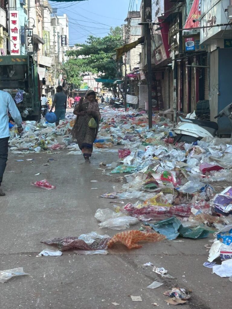 सणानिमित्त मोठी आर्थिक उलाढाल झाली असली तरी, स्वच्छतेच्या बाबतीत मात्र व्यापाऱ्यांनी बेजबाबदारपणा दाखवल्याचे चित्र आहे. रस्त्याच्या दुतर्फा साचलेल्या प्लास्टिक पिशव्या, कागदी पुठ्ठे आणि इतर टाकाऊ वस्तूंमुळे भुसार लाईनचा रस्ता अक्षरशः कोंडला गेला आहे. हा प्रकार केवळ वाहतुकीसाठी अडथळा नसून, आरोग्यासाठीही गंभीर धोका निर्माण करत आहे.