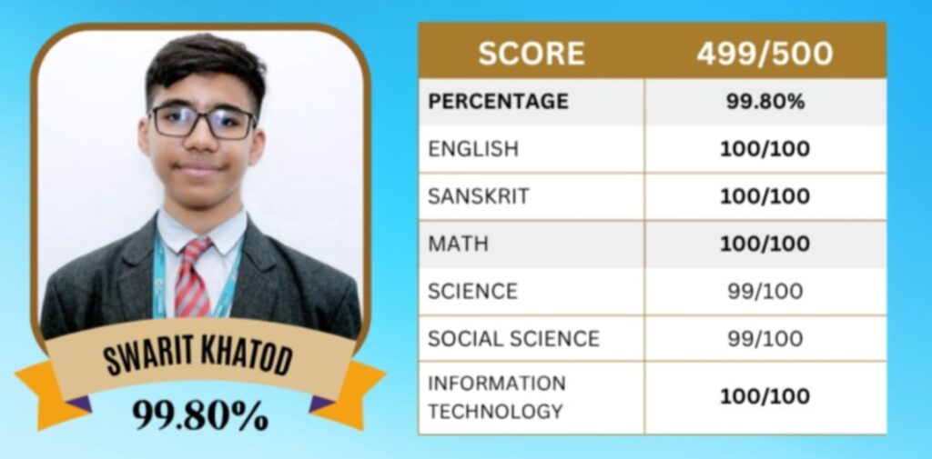 विद्यालयाचा स्टार विद्यार्थी स्वरीत खटोड याने ५०० पैकी ४९९ गुण मिळवत अभूतपूर्व यश संपादन केले. त्याने इंग्रजी, संस्कृत, गणित आणि आयटी या चार विषयांत १०० पैकी १०० गुण मिळवले, तर विज्ञान आणि सामाजिक शास्त्र विषयात ९९ गुण प्राप्त केले.