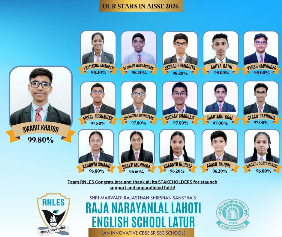 लातूर: केंद्रीय माध्यमिक शिक्षण मंडळाने (CBSE) घोषित केलेल्या इयत्ता १० वीच्या (AISSE 2026) निकालात लातूर येथील राजा नारायणलाल लाहोटी इंग्लिश स्कूलने आपल्या दैदिप्यमान यशाची परंपरा कायम राखली आहे. विद्यालयाचा निकाल सलग १४ व्या वर्षी १०० टक्के लागला असून, स्वरीत कमलेश खटोड याने ९९.८०% गुण मिळवून विद्यालयात प्रथम येण्याचा बहुमान मिळवला आहे.